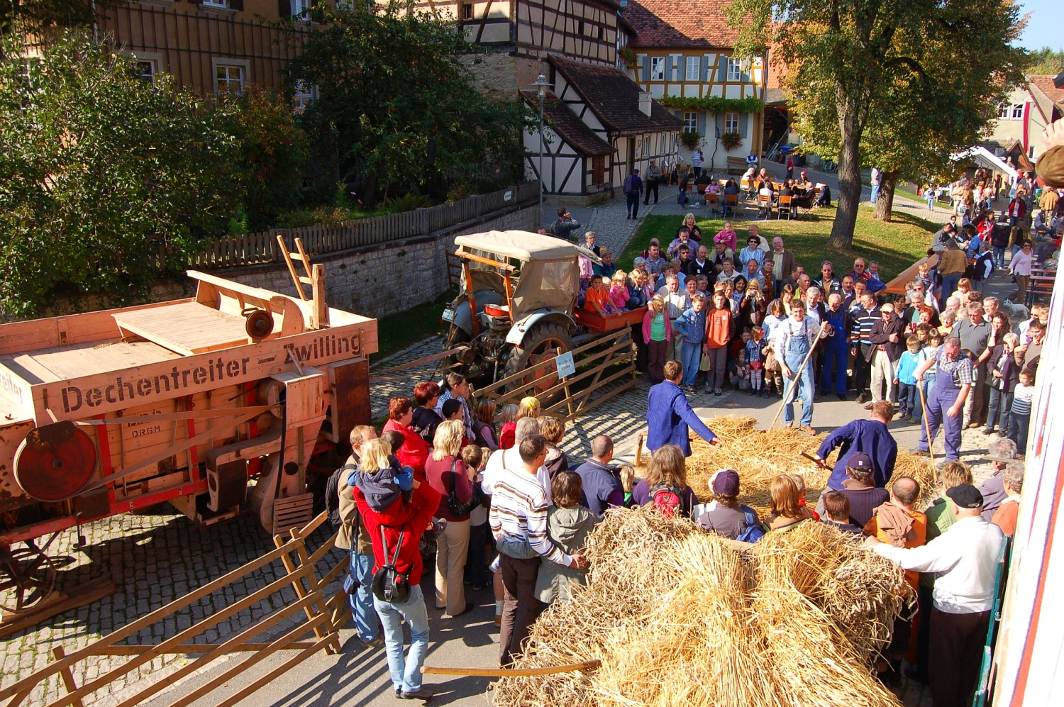 Beim alljährlichen Herbst- und Kelterfest im Kirchenburgmuseum steht der Herbst als Ernte- und Festzeit auf dem Land im Mittelpunkt. Im Dorf Mönchsondheim kommen vor der historischen Kulisse des alten Rathauses wie früher Dreschflegel zum Einsatz, um die Körner aus den Ähren des geernteten Getreides herauszuschlagen. Für die Trennung der Spreu vom Weizen sorgt im Anschluss die Windfege. Der technische Fortschritt gegen Ende des 19. Jahrhunderts wird mit der über Transmissionsriemen angetriebenen Dreschmaschine lebendig. Darüber hinaus führen die Mönchsondheimer das Hobeln und Einstampfen von Weißkraut und das „Aufbocken“ eines Kleebocks vor. Wie schwer wohl ein Strohballen wiegt? Das dürfen Besucher bei einem Schätzspiel erraten.