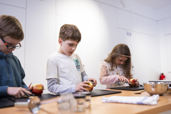 Danach sammeln wir gemeinsam Äpfel ein und kochen leckeres Apfelmus.